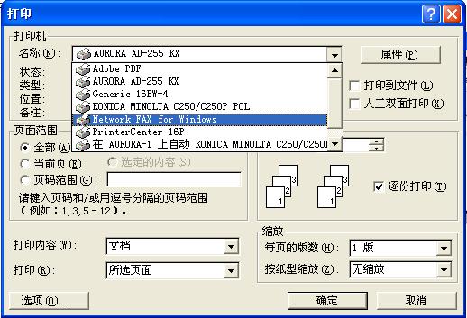 2、 在打印機名稱里選擇“Network Fax For Windows”,單擊“確定”