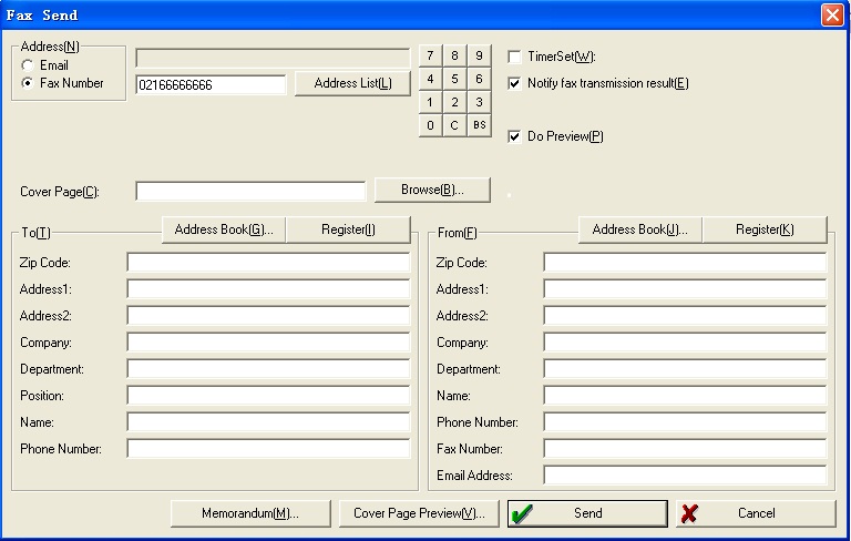 3、 在彈出的傳真發送對話框中,輸入目的傳真號碼,然后單擊“Send”