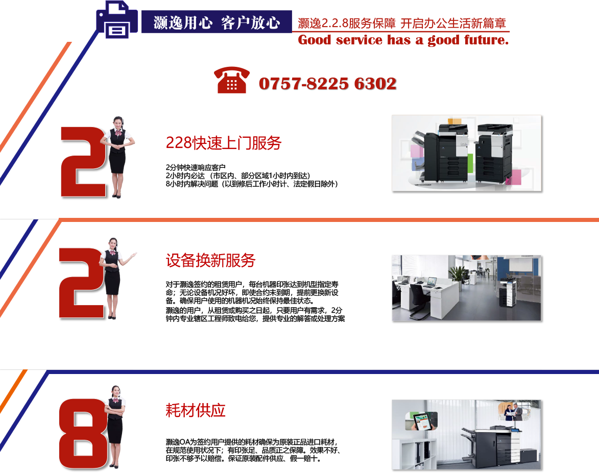 為給客戶提供更好更及時的服務,是灝逸OA的宗旨,公司已在佛山五區設立多家服務部。為實現佛山本土最專業的辦公設備外包服務商的目標,灝逸辦公在成立之初就確立了長期的發展規劃和團隊建設計劃,在多年的發展中,已建立了完善的客戶服務體系、銷售方案體系、人才培訓體系以及管理體系。在服務快捷、品質保障、進取創新、誠信雙贏的企業原則指導下,我們不斷改進服務品質,積極努力提升客戶滿意度。我們堅信:我們能用專業的服務體系,和創新的服務理念成為您企業健康發展的強有力保障。共同的選擇在日益激烈的市場競爭環境中為取得競爭優勢,企業運營費用的有效管理和控制顯得尤為重要,其中如何合理的采夠辦公設備可謂重中之重。現在,有了灝逸辦公的幫助,您可以全力以赴的專注于自己的商業目標,將精力全部投入到企業的核心業務上,不用再為辦公設備成本控制而費心,我們能為您在辦公自動化領域中提供最細心、全面、長期的呵護。
