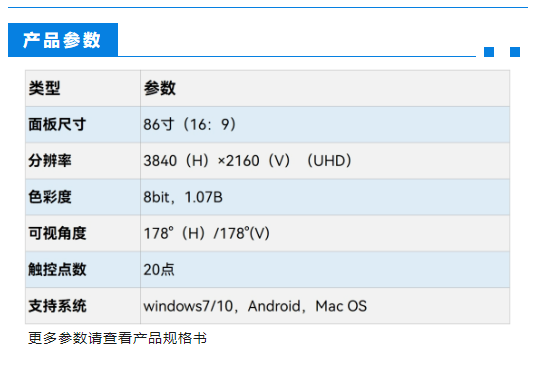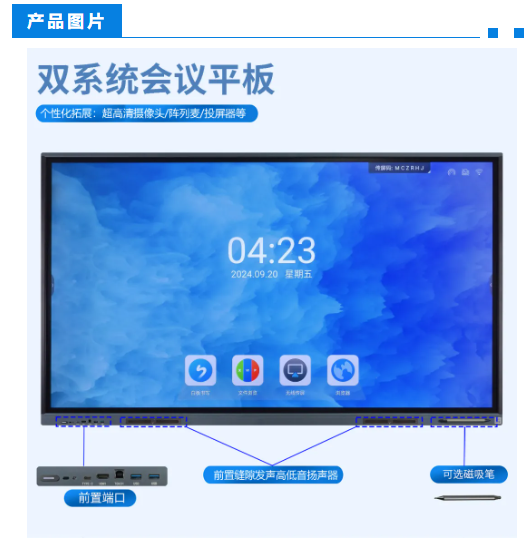 質(zhì)感全黑外觀、視覺零貼設(shè)計(jì)、高精度紅外觸控、前置多功能端口、定制揚(yáng)聲器方案、 三種系統(tǒng)方案可選,多樣化的產(chǎn)品硬件拓展(超高清攝像頭/數(shù)字麥/投屏器等)