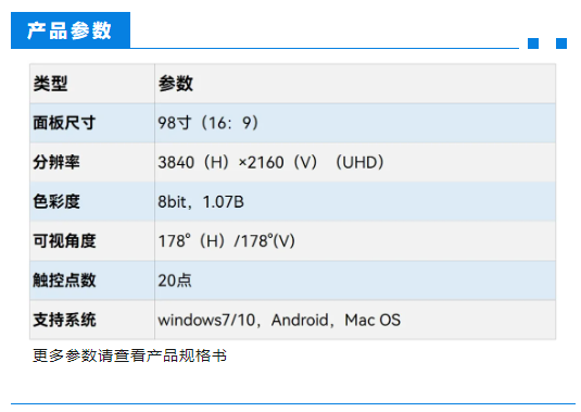 質感全黑外觀、視覺零貼設計、高精度紅外觸控、前置多功能端口、定制揚聲器方案、 三種系統方案可選,多樣化的產品硬件拓展(超高清攝像頭/數字麥/投屏器等)